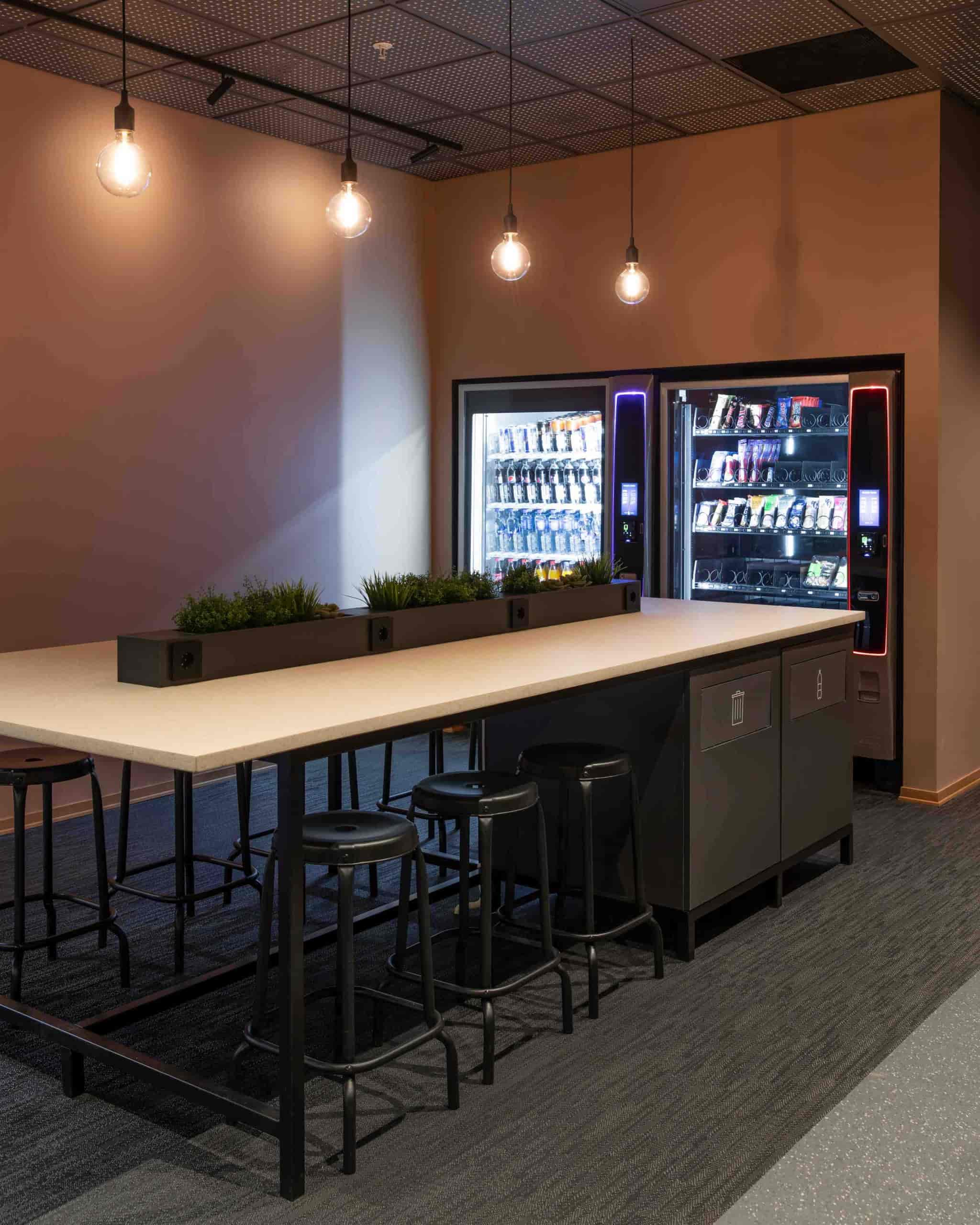 Aamiainen ei sisälly hintaan. Kahvia ja välipaloja voi ostaa aulassa olevista automaateista. Meillä on myös mikroaaltouunilla, leivänpaahtimilla ja vedenkeittimillä varustettu vieraskeittiö, joten voit valmistaa aamiaisesi itse. Voit myös ostaa aamiaisen jostakin aulan yhteydessä olevista ravintoloista.